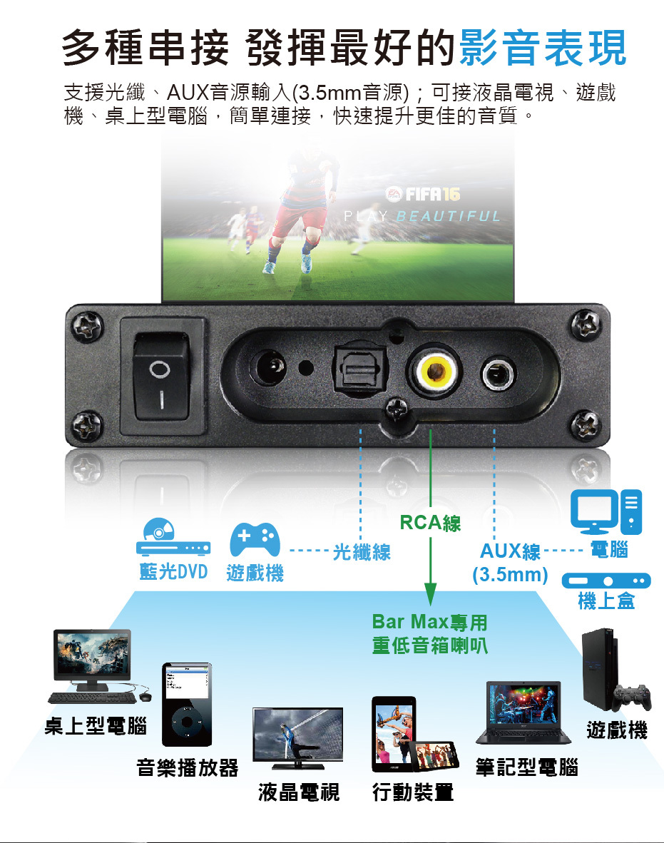 ◆支援光纖及AUX音源輸入