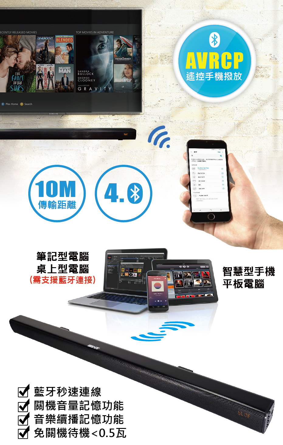 ►藍牙AVRCP功能,解決手機充電不方便時,以遙控器操作