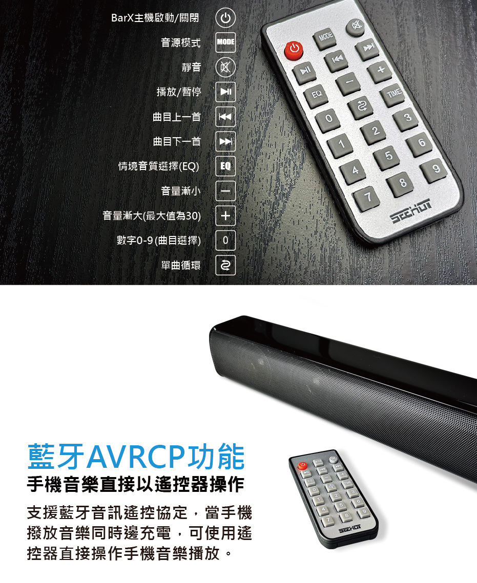 ◆藍牙AVRCP功能,解決手機充電不方便時,以遙控器操作