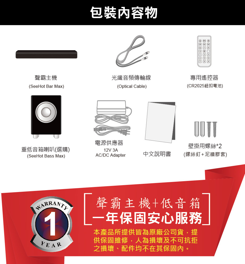※包裝內容物:聲霸音響*1、重低音箱喇叭*1、