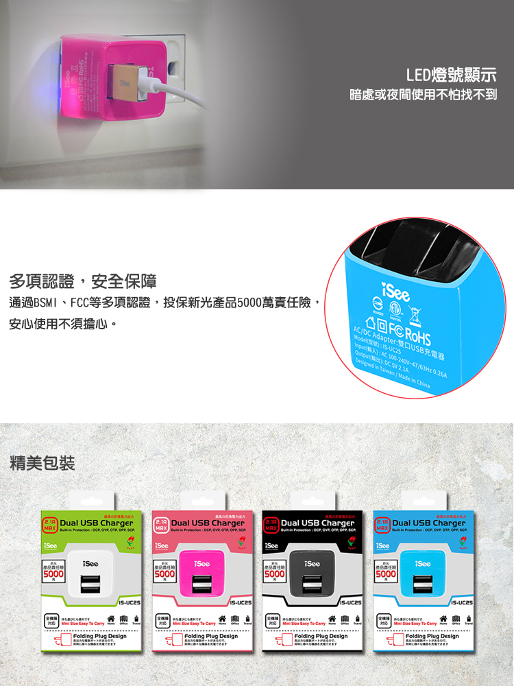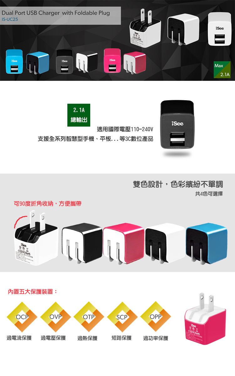 ◆摺疊收納AC插頭設計,外型輕巧,家用、旅行最佳充電器。