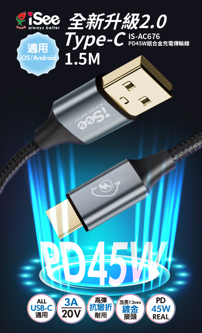 iSee 45W Aluminum PD Cable 1.5m (IC-AC676) Gray
