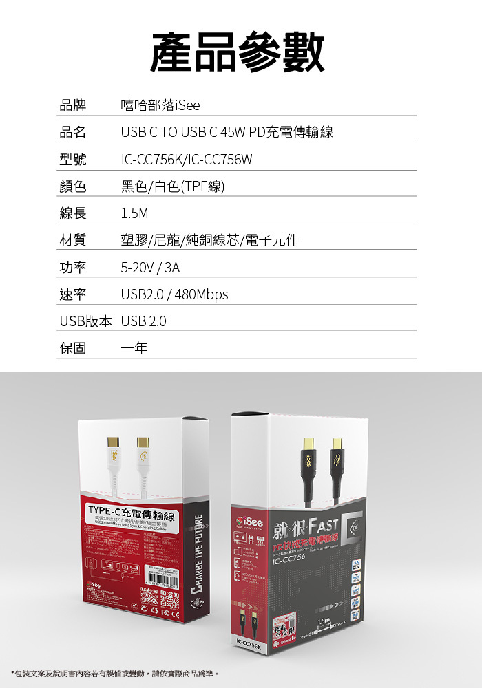 iSee 45WPD充電傳輸線1.5米 (IC-CC756) 白色