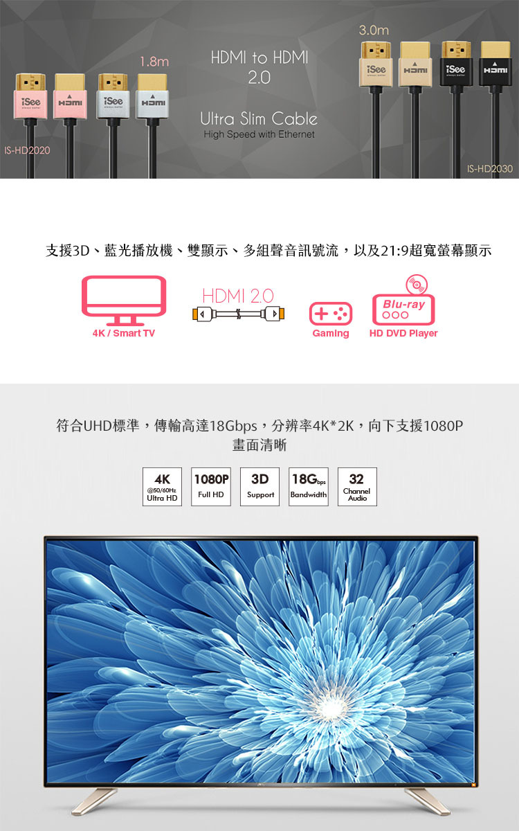 福利品 iSee HDMI 2.0 鋁合金超高畫質影音傳輸線180cm (IS-HD2020)