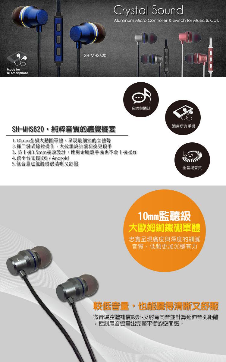 ※產品功能商品配備:SH-MHS620線控耳機麥克風*1,大、中(已在耳機本體)、小各一對耳塞,束線帶*1